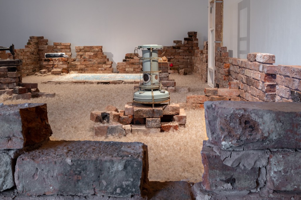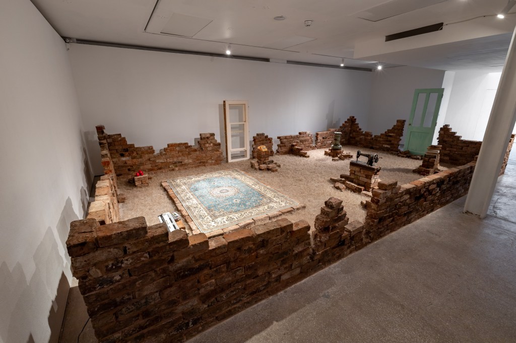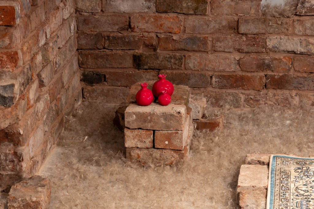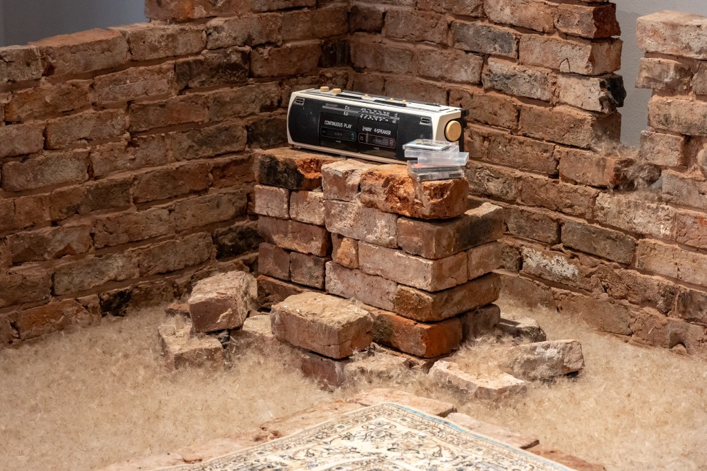 Resonance and Remnants, dandelion seeds, bricks from a demolished house, and objects related to my childhood, pulsing with sound and saffron scent.