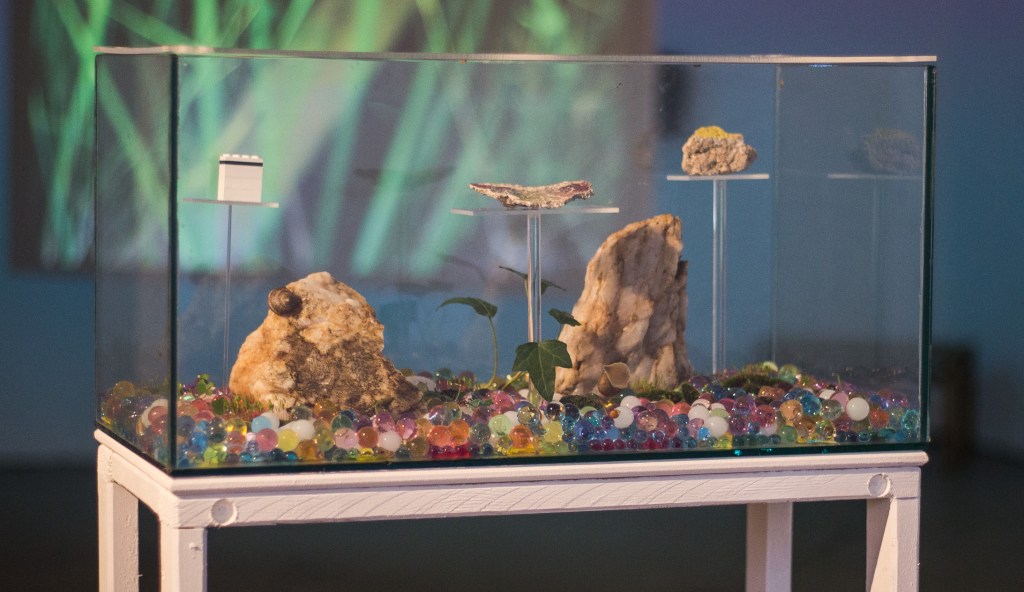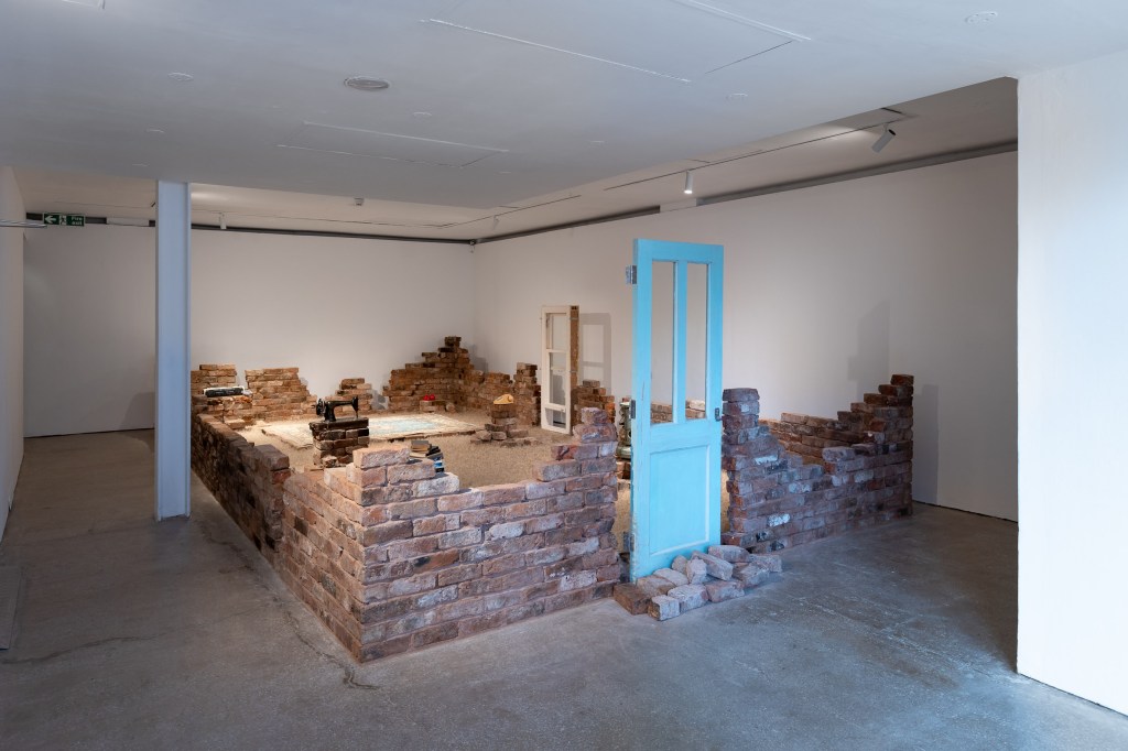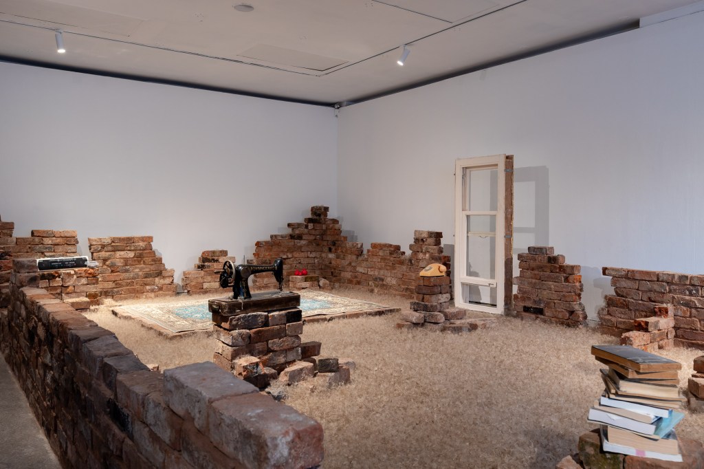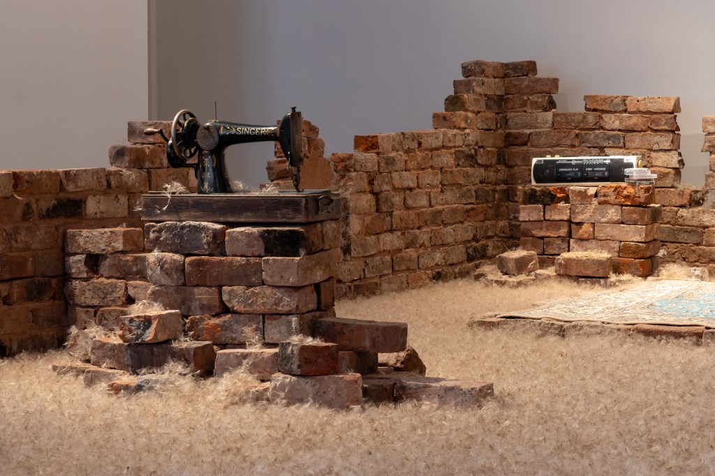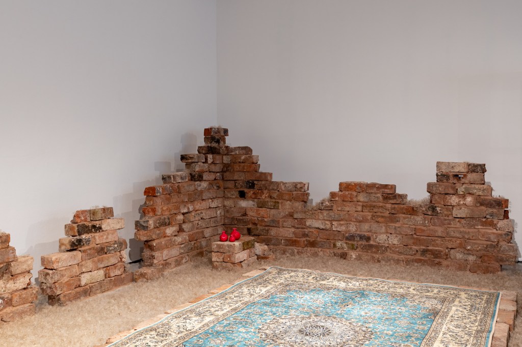 Resonance and Remnants, dandelion seeds, bricks from a demolished house, and objects related to my childhood, pulsing with sound and saffron scent.