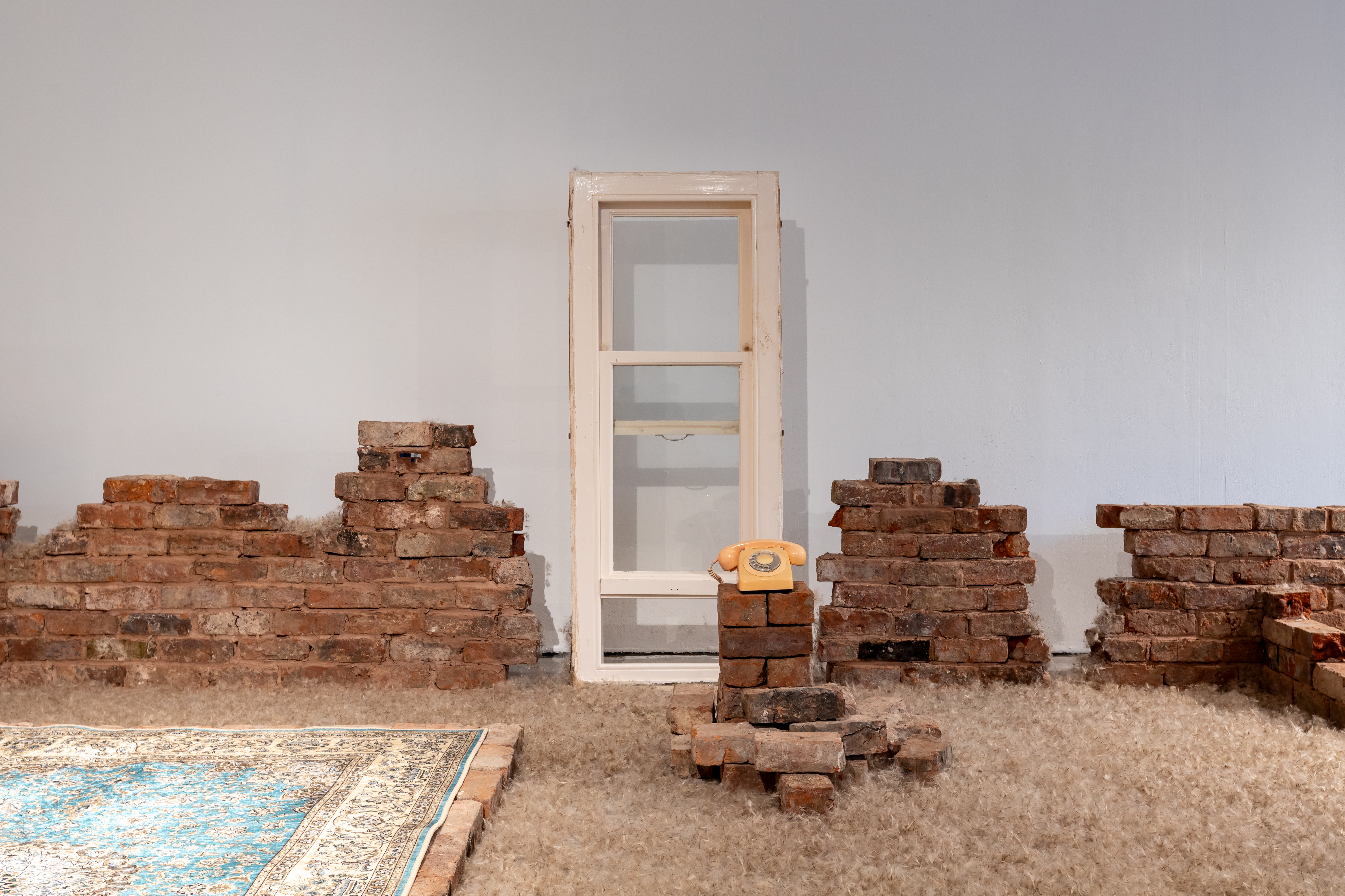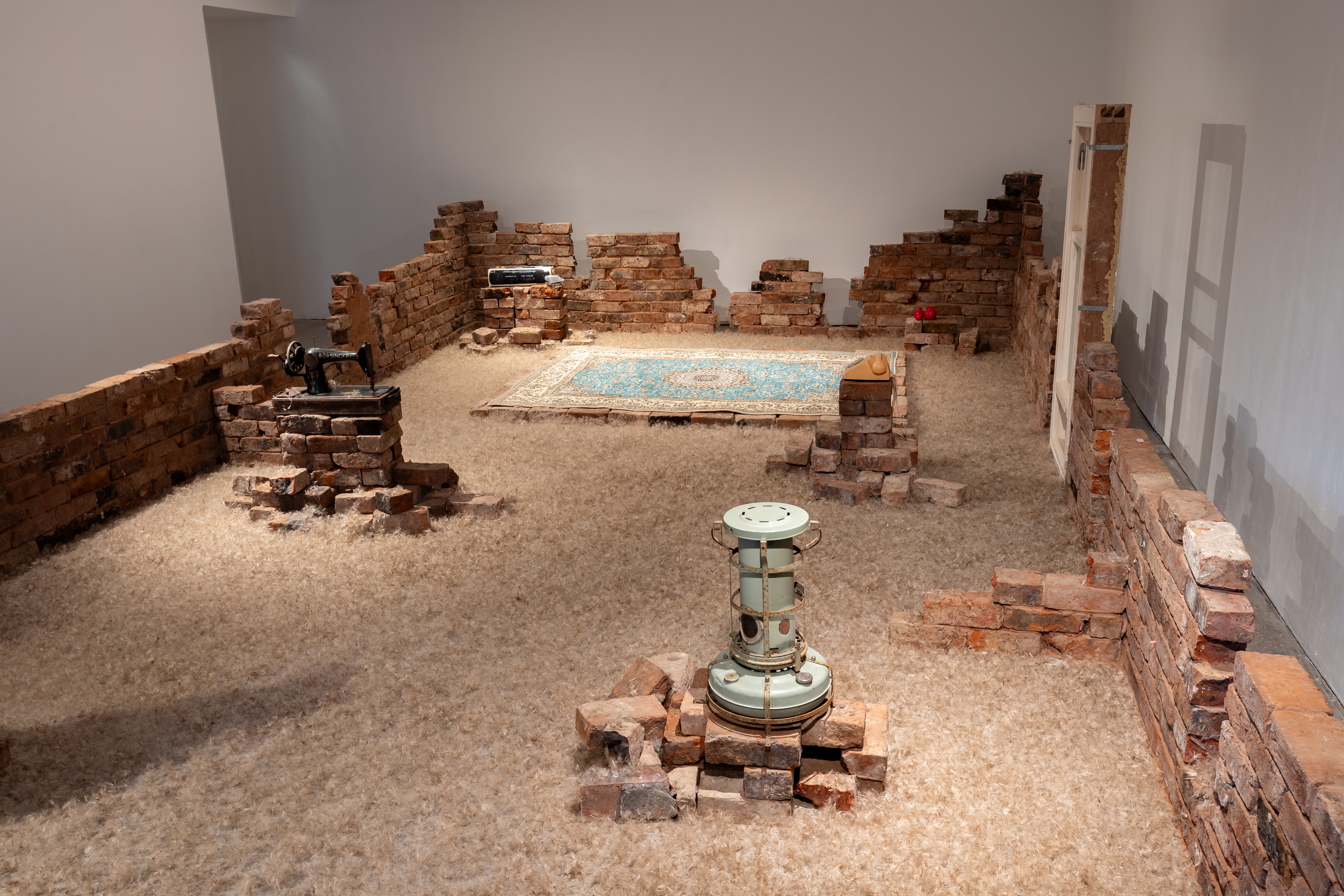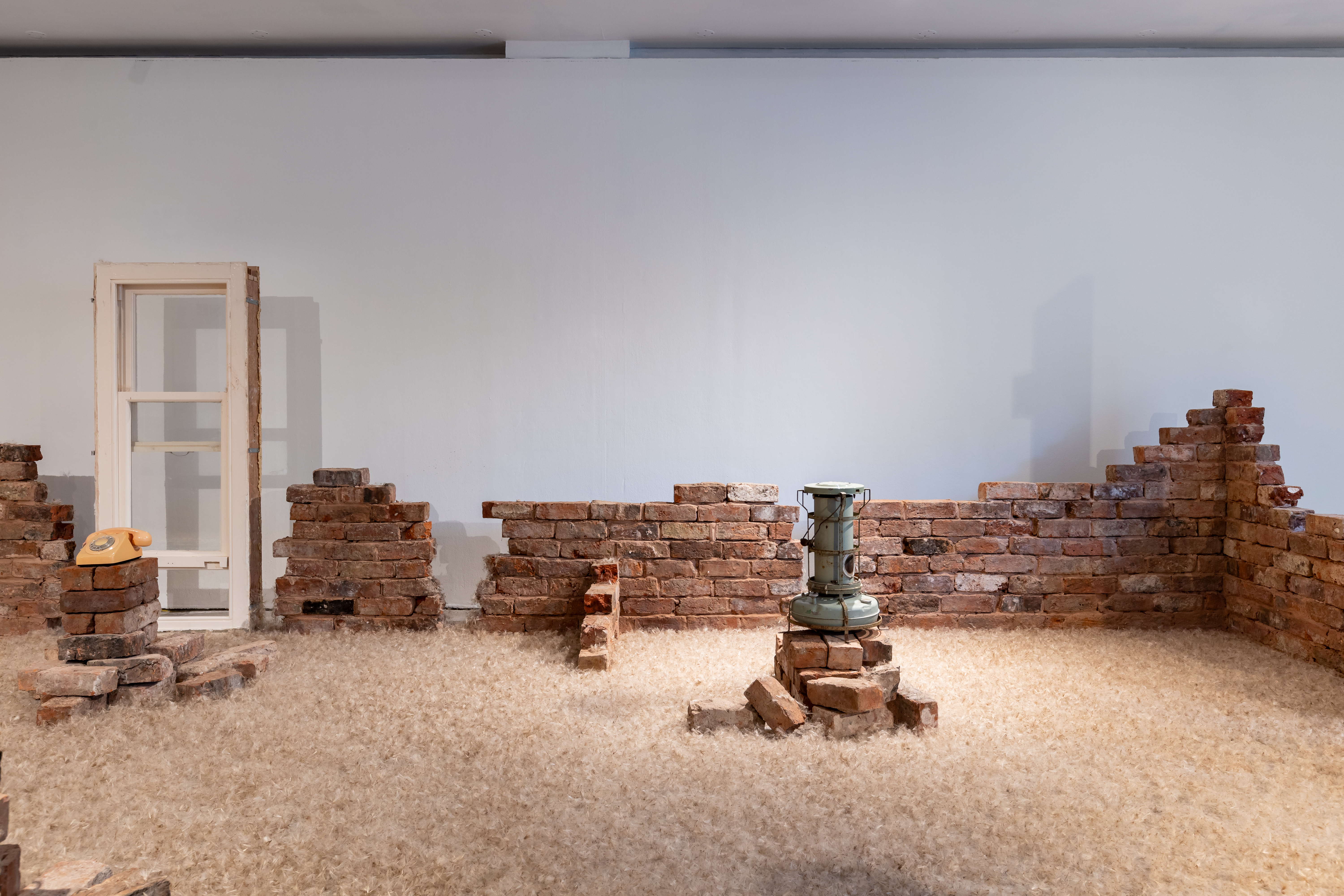 Resonance and Remnants (2023) built in situ in the gallery space using reclaimed bricks from demolished houses, objects related to my childhood, dandelion seeds, Sound and Saffron Scent! Photo: Jules Lister