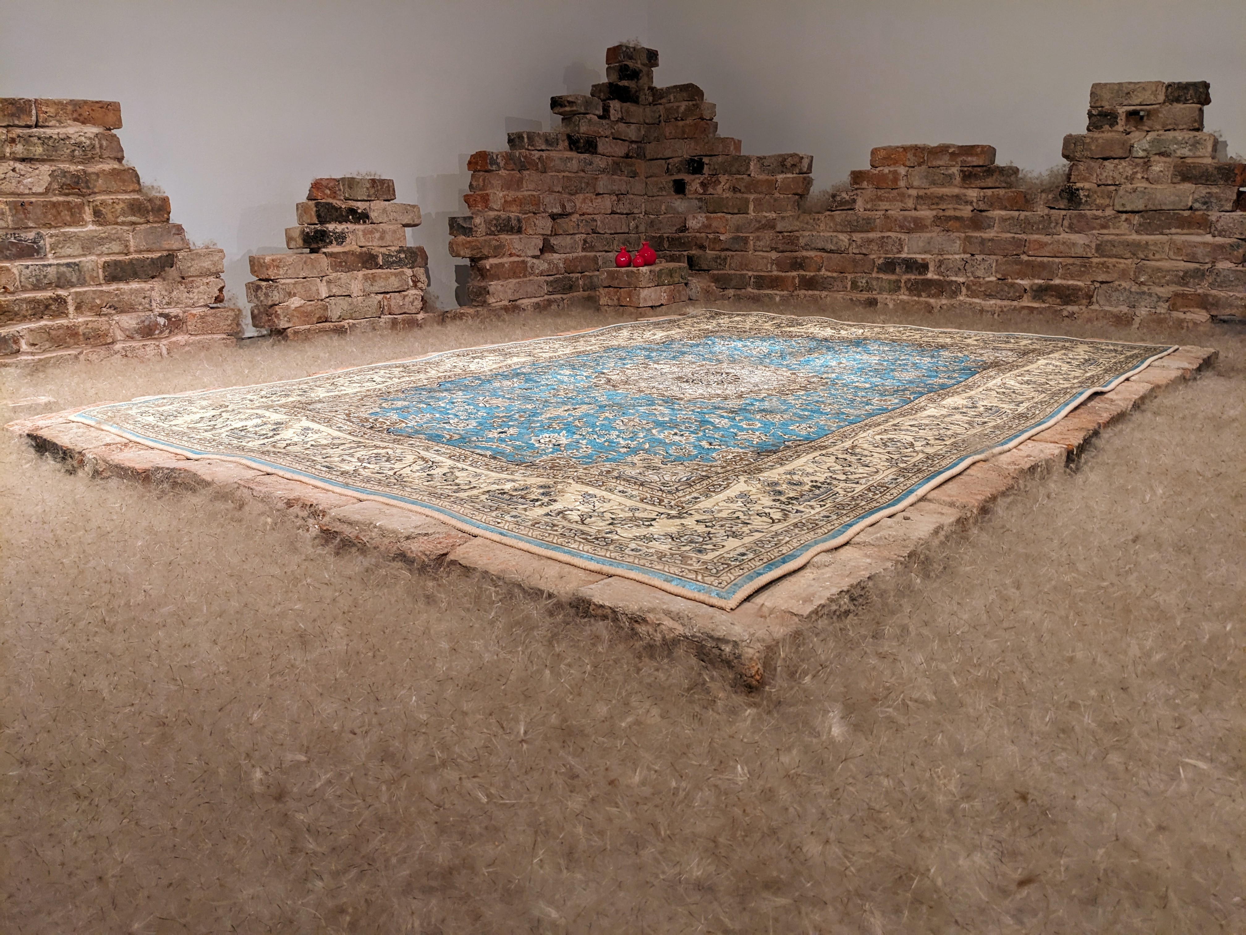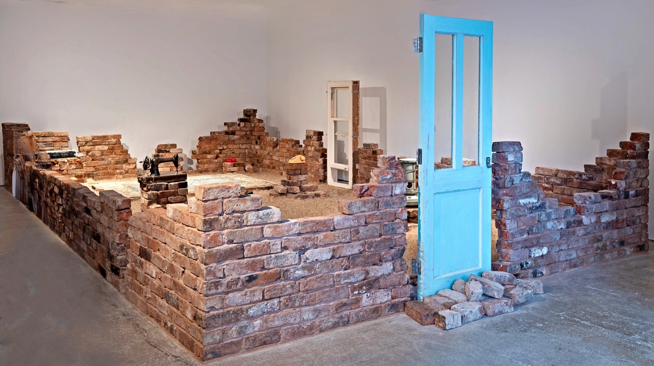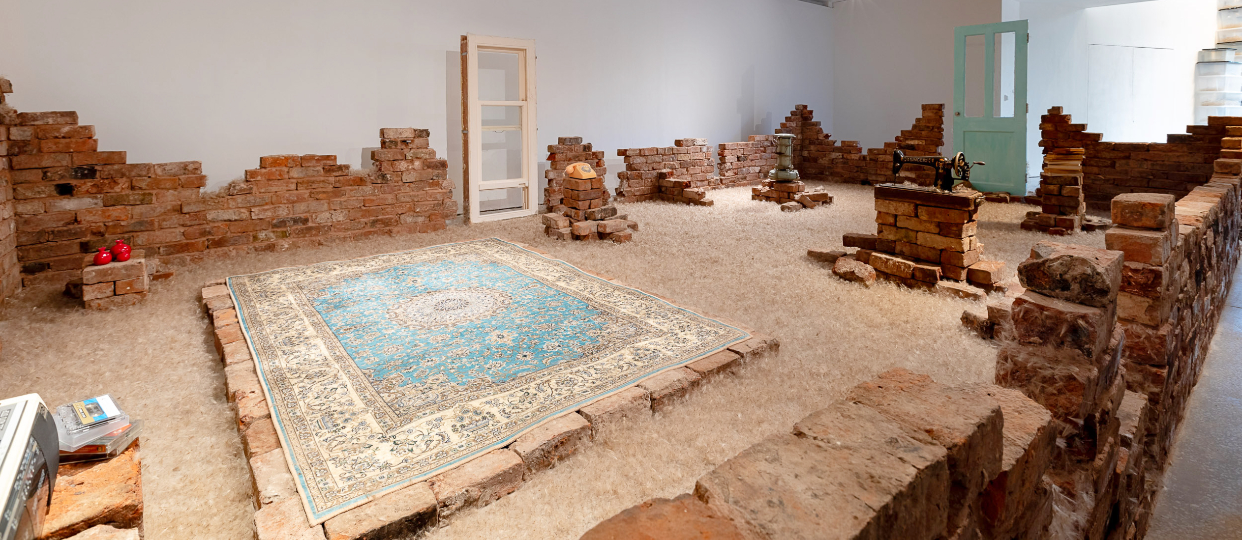 Resonance and Remnants (2023) built in situ in the gallery space using reclaimed bricks from demolished houses, objects related to my childhood, dandelion seeds, Sound and Saffron Scent! Photo: Jules Lister