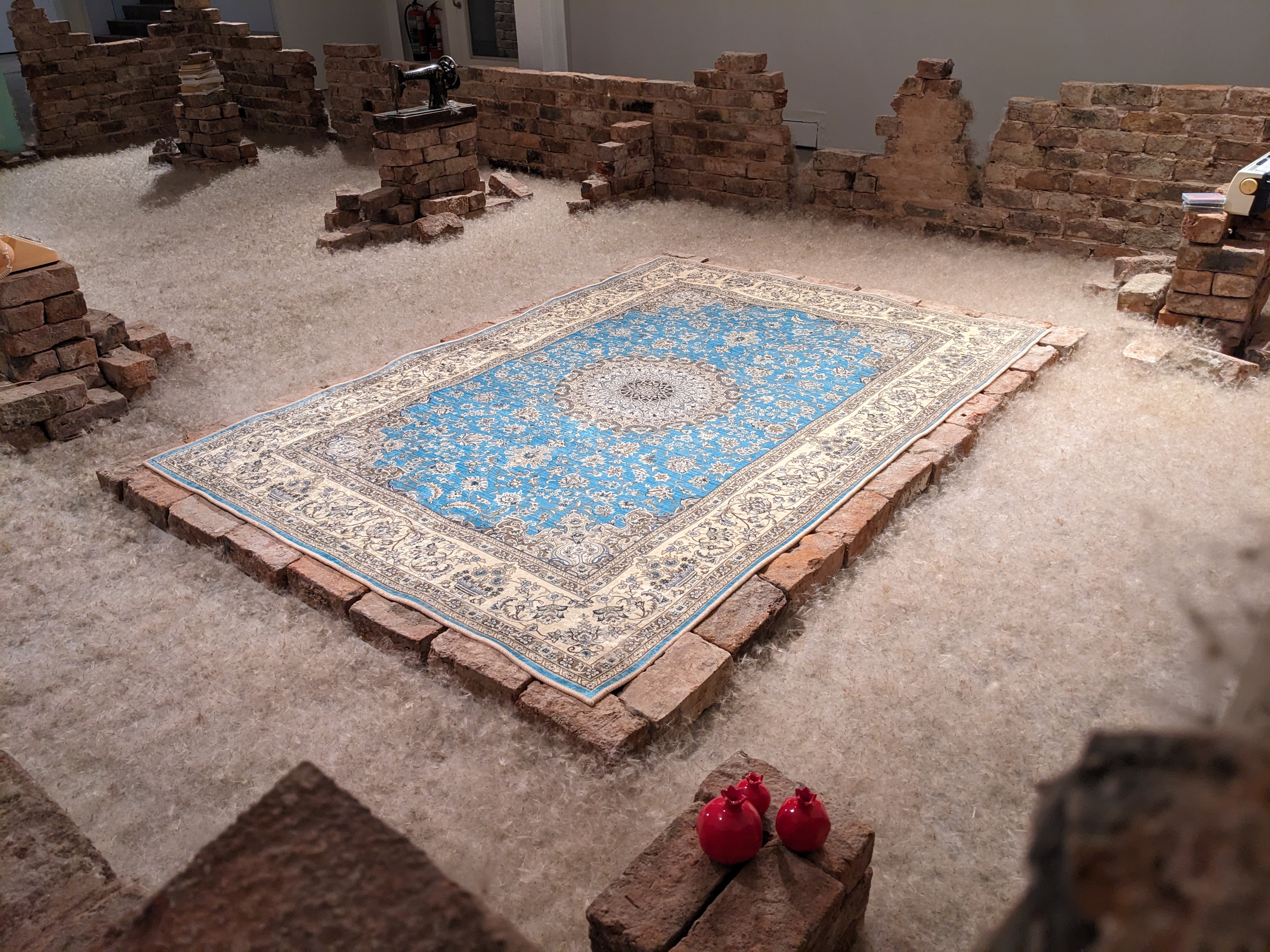 Everything is Fine, Persian Rug and Robot vacuum cleaners, https://vimeo.com/593250332 Autopsy of a HOME, Chalk Paint on Glass, Stain Glass film, painting, Video, Carpet, LEDS, Mobile PhoneTerrarium( Hyper reality ), Glass tank, Pieces of Berlin Wall, Legos, Plants , Stones, Snails, crystal soil water beads, 60 x 30 x35Falling, Shaved Persian Carpet, Wooden Timbers, 350cm x 250cmFour Conners Border backpackThe List Untitled Lost BoatFlying KiteSaving Lifeboat